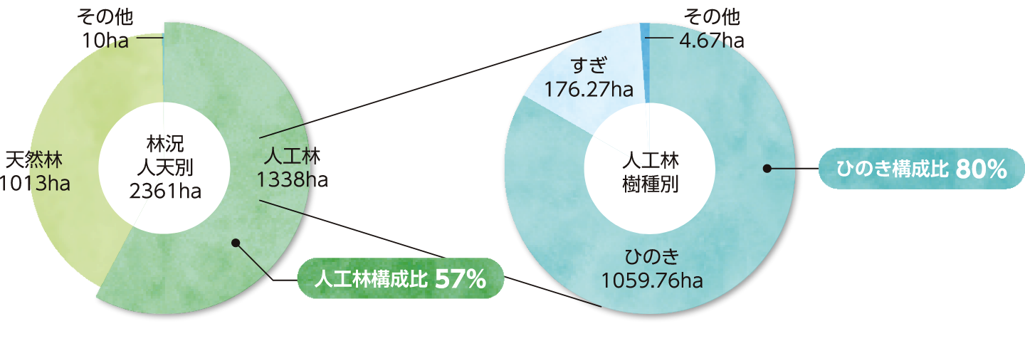 木谷山林(王泊山林含む)の43%が天然林、57%は人工林です。